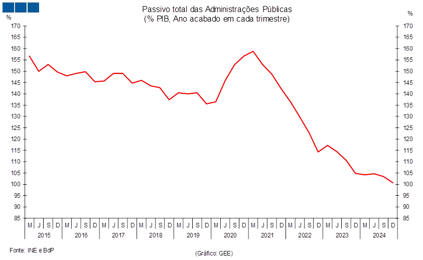 Em dezembro de 2024, o Passivo Financeiro das Administrações Públicas fixou-se em 100,6% do PIB (286 974 milhões de euros). Em percentagem do PIB, trata-se de uma diminuição de 2,8 p.p. face a setembro de 2024 (103,4%).