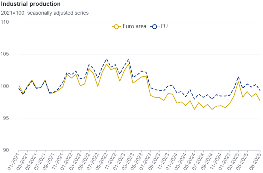 Em agosto de 2025, a produção no sector industrial, ajustada de dias úteis, registou variações de -1,2% na Zona Euro e -1,0% na UE, face ao mês anterior. Em julho de 2025, a produção industrial tinha registado variações de 0,5% na Zona Euro e de 0,4% na UE.